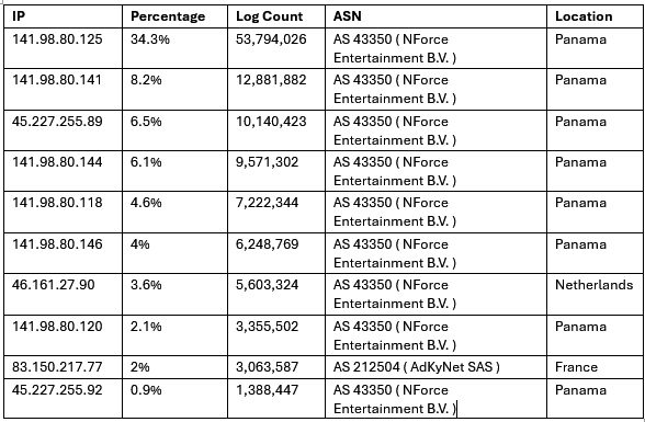 Autonomous System Numbers (ASN) 43350 accounted for 71.6% of the total sensor logs! This ASN belonging to NForce Entertainment but NForce Entertainment appears to often lease out its IP space to other VPN and proxy providers like the Panama based Flyservers S.A. Flyservers is categorized as a “potentially very high fraud risk ISP” by Scamalytics and is likely the source of this activity.