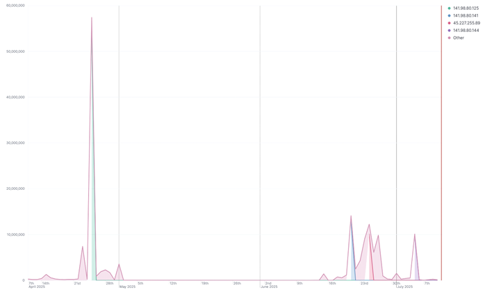 Digging into the source of this anomaly, I filtered for traffic by day and found that there were massive spikes on just a few days in the last three months that accounted for most of the DShield sensor’s captured volume.